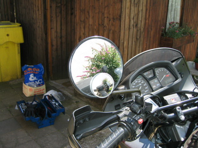 Kleine runde Totewinkelspiegel aus dem Autozubehör in die normalen Spiegel unten eingeklebt. Hilft beim Überholen und rückwärts einparken.