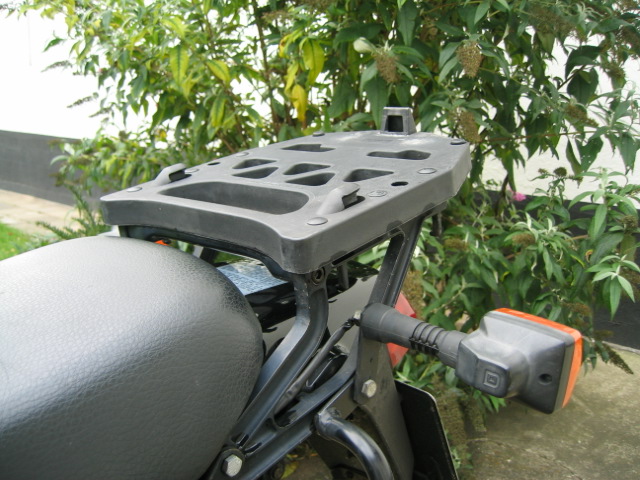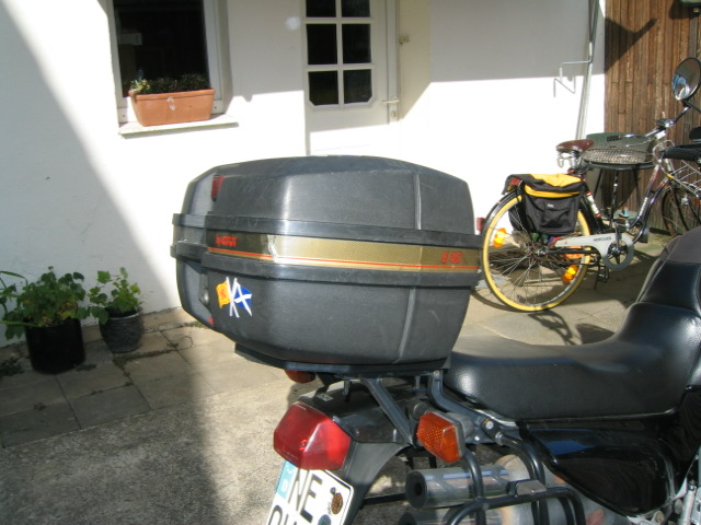 Die Honda-Platte wurde durch die Givi-Grundplatte ersetzt. Das Givi Monokey-Topcase passt da direkt drauf. Bietet Platz für 2 Integralhelme oder kleine Einkäufe.